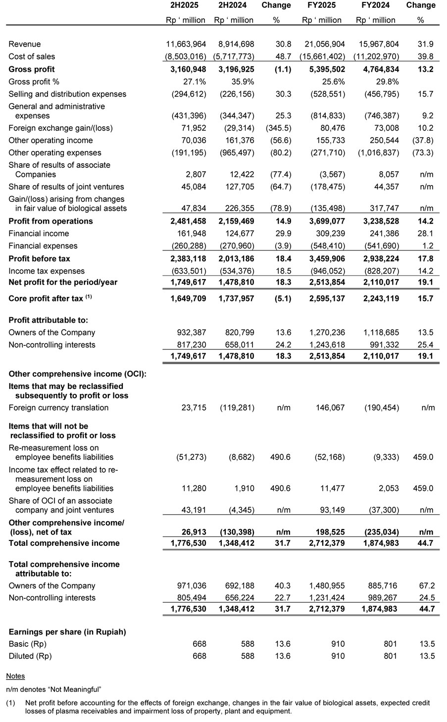 On a full-year basis, the Group delivered an improved set of results with higher revenue and profit. Total sales grew 32% to Rp21.1 trillion in 2025 on higher selling prices and volumes. Net profit after tax improved 19% to Rp2.5 trillion, reflecting higher gross profit and factors similar to those in 2H2025.