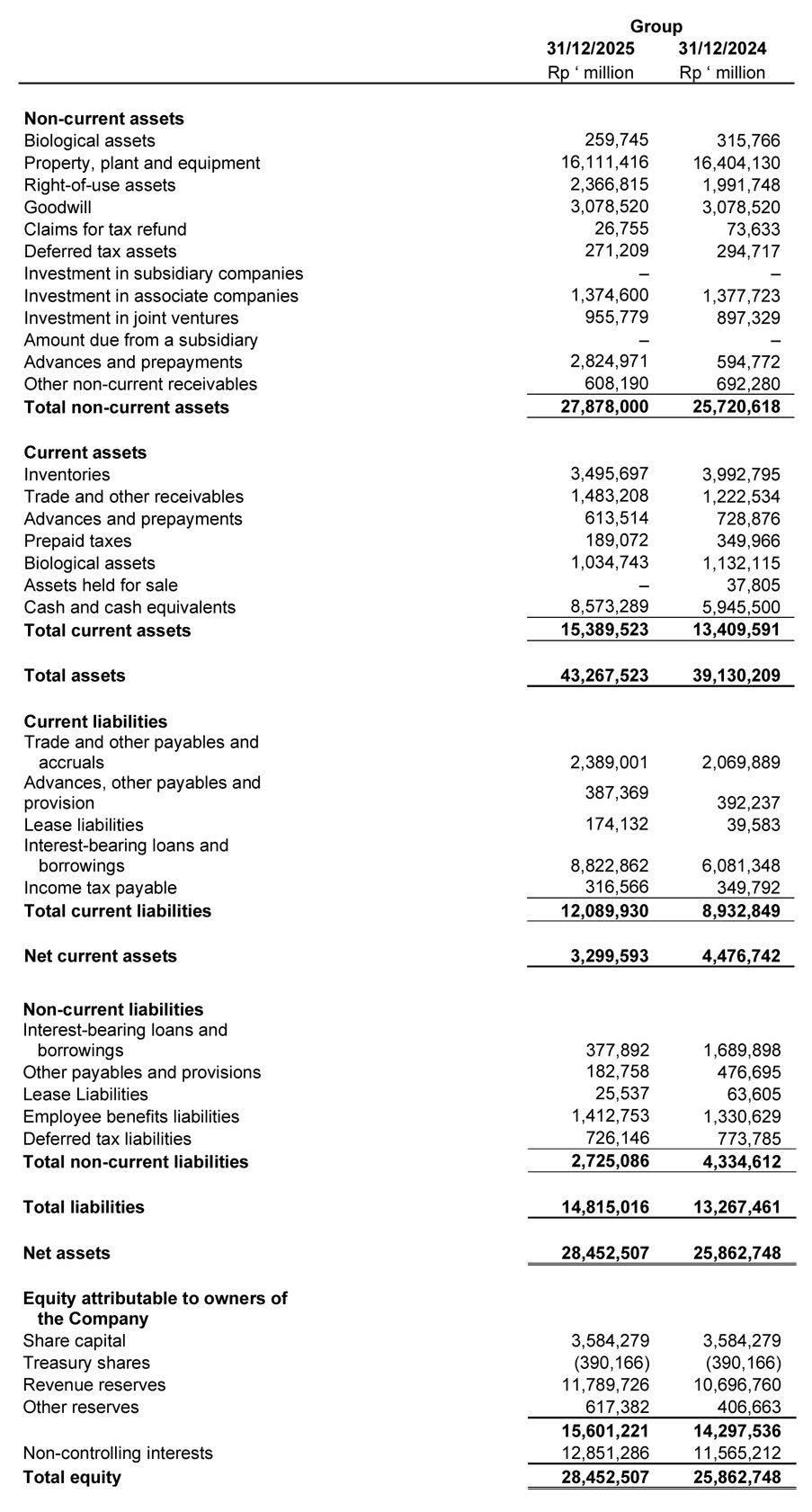 The Group’s total current assets stood at Rp15.4 trillion as at 31 December 2025, up from Rp13.4 trillion as at 31 December 2024. The increase was driven by increases in trade and other receivables and cash levels. This was partly offset by lower CPO inventories and finished products in the EOF division, along with decreases in advances for raw material purchases, prepaid taxes and biological assets.